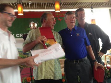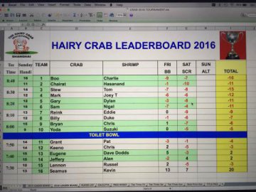 Boom & Charlie road Boom's off-the-stick first round 71 to lead the tourney for 53 holes. But like many before them, on Sunday, met their demise in the Spring City Mountain Course's 18th hole ravine. B&C finished tied for 2nd with Hedgehog/Bama Tom two shots back. Rienk/Eddie and and the Thai boys Chariat/Hasanand rounded out the money winners in a 4th place tie a further four adrift.